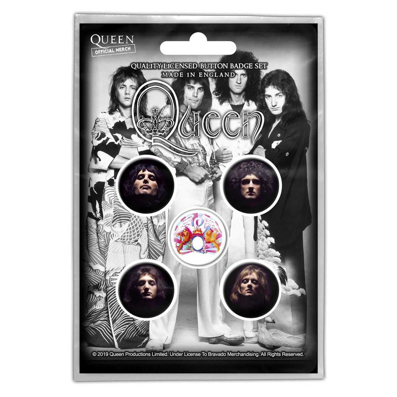 An official licensed Queen Button Badge Pack featuring the ‘Faces’ design motif.